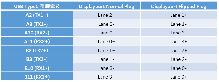 通过列表可以看到,Displayport在应用Alter Mode中与TypeC接口对应的连接定义是有差别的,因为正向插入(Normal Plug)和反向插入(Flipped Plug)连接对应的引脚是会改变: