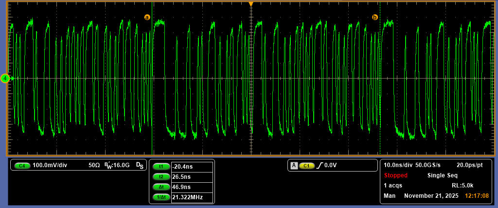 如果按照一致性标准的要求,相邻的lane之间有20UI的偏移,即370ps x 20 = 7.4ns, 那么可以看到上图中不同颜色的标记代表了不同lane之间间隔还是存在依次递增的关系,并且时间差不过就在7.4ns左右。